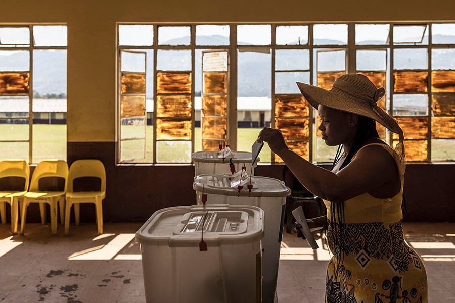 A voter casts her ballot during Eswatini"s parliamentary elections at a voting station at the National High School in Lobamba on September 29, 2023. The kingdom of Eswatini is one of the world"s last remaining absolute monarchies, where fifty-one men and eight women were elected to Eswatini"s parliament in last week"s election. Most married women in Eswatini have "the status of legal minors", according to Amnesty International.