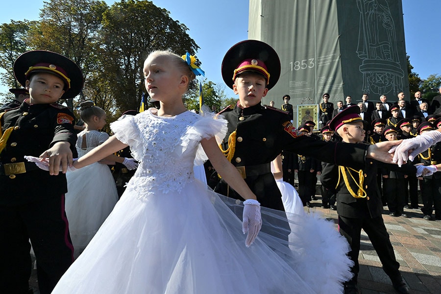 Young Ukrainian cadets of Lyceum No. 23, a military boarding school dance after the graduation ceremony at the Monument to Prince Volodymyr in Kyiv on September 29, 2023, amidst the Russian invasion of Ukraine.