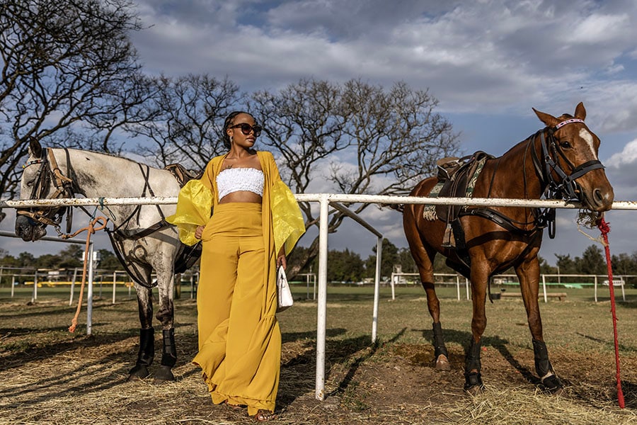 A polo fan poses with polo ponies during the Casino Cup at the Nairobi Polo Club in Nairobi, Kenya, on September 23, 2023. Founded in 1907, the Nairobi Polo Club is the oldest in East Africa and hosts several prominent tournaments every year. Polo is gaining immense popularity in Nairobi as more Kenyans become interested in the polo culture and its lifestyle.