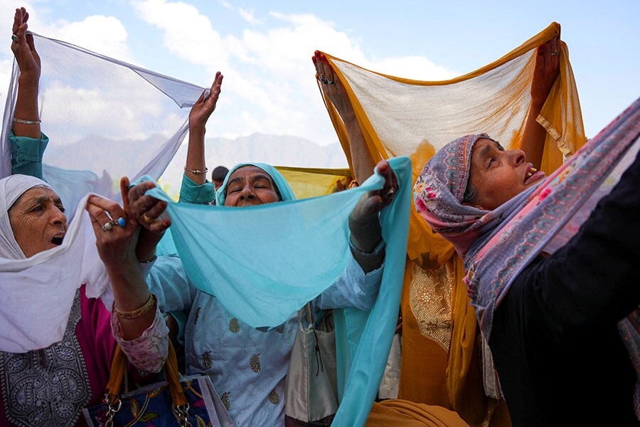 Kashmiri Muslim women pray upon seeing a relic that"s believed to be hair from the beard of the Prophet Mohammad, displayed during the festival of Eid-e-Milad-ul-Nabi, the birth anniversary of the Prophet at Hazratbal Shrine in Srinagar, J&K, on September 29, 2023.