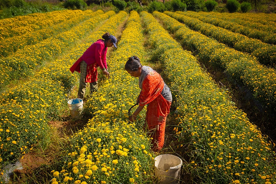 Women tend to chrysanthemum flowers in a field on September 24, 2023, in Melukote, Karnataka. The market prices for the flower crop have plummeted, leaving many farmers in distress, attributed by experts to excess production of flowers and inflow of chrysanthemum from neighbouring states.