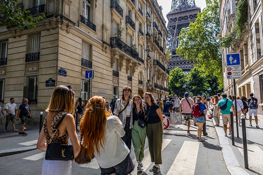 Tourists pose for a photo with the Eiffel Tower in the background in Paris on August 4, 2024, during the Paris 2024 Olympics games. Image: Olympia DE Maismont / AFP