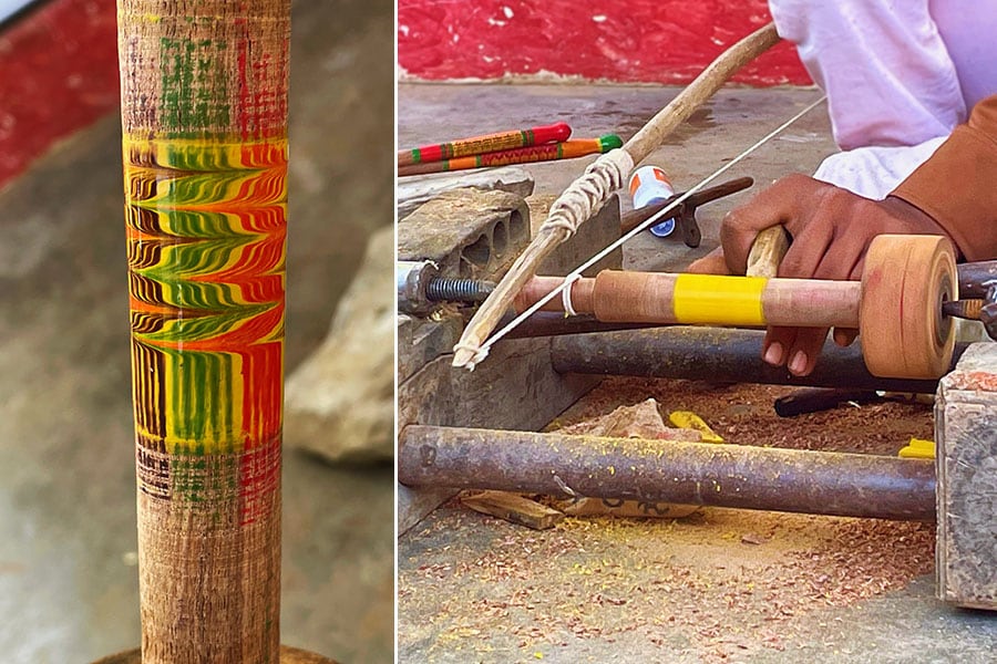 He adds, “Lac resin becomes a palette, its colours mingling to breathe life into carved wooden forms. A woodworking vice grips the wood, while a manual belt undertones as it turns, ready for the artist"s touch. Guided by a manual lathe and a handful of chisels, we etch zigzag patterns that distinguish our work from the tapestry of traditional woodcraft."