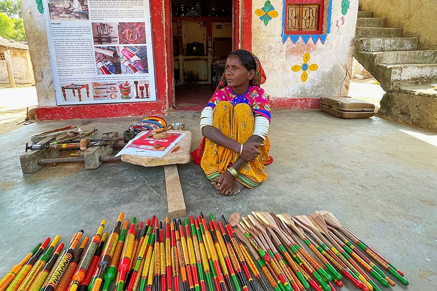 The men breathe life into the wood, crafting cookware, toys, and ornate treasures. Meanwhile, the women play a vital role, gathering wood, preparing lac resin, crafting natural pigments with stones, and even concocting adhesives from babool tree gum. Each piece, a canvas for their collective artistry, bursts with the colourful zigzag motifs, a signature technique. To preserve its vibrant beauty, they use groundnut oil—a simple application that rekindles the lustre, making cherished pieces feel brand new again.