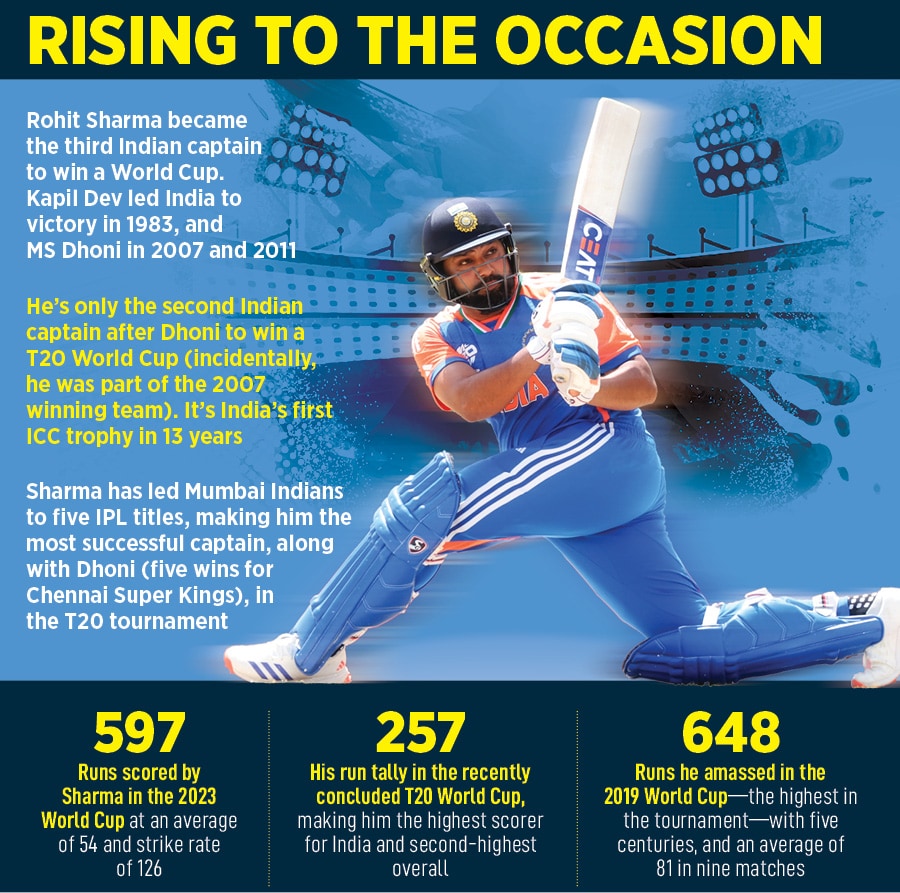Being Rohit Sharma hasn’t been easy in the past few months. On Saturday, he became only the third Indian captain to win a World Cup, after Kapil Dev (1983) and MS Dhoni (2007 and 2011). It’s ironic that the player who led India to three ICC finals since last June was not the captain of any of the 10 Indian Premier League (IPL) teams this year. Mumbai Indians—that won five IPL titles under Sharma’s captaincy—replaced him with all-rounder Hardik Pandya, who had led Gujarat Titans to two IPL finals (and won one) in the last two years. The Mumbai Indians fans felt betrayed at the manner in which the most successful IPL skipper (along with Dhoni, who led Chennai Super Kings to five trophies) was ousted. Pandya bore the brunt of the decision—and his own poor form in the IPL—with the crowd unfailingly booing him at every venue, especially at the team"s home ground, Wankhede Stadium in Mumbai.