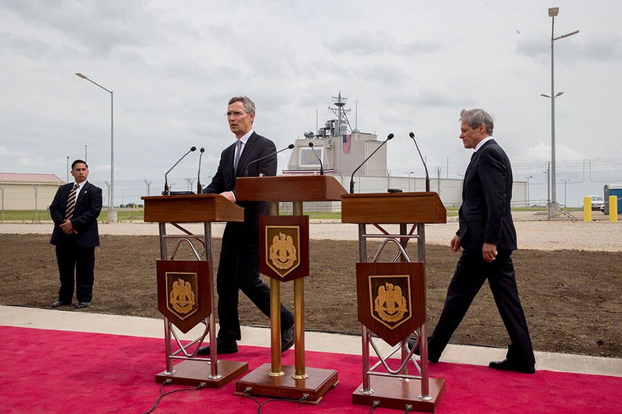 A file photo of NATO and Romanian officials at the inauguration ceremony of a missile defense facility in Deveselu, Romania. Image: Kay Nietfeld/picture alliance via Getty Images