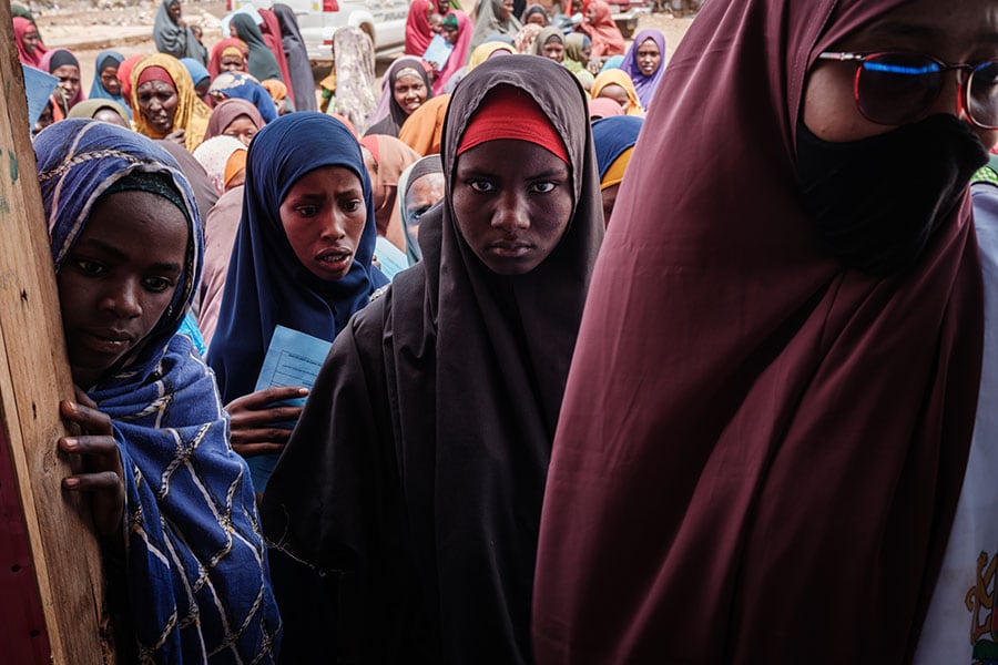 Young mothers wait for high-nutrition foods and health services at the Tawkal 2 Dinsoor camp for internally displaced persons (IDPs) in Baidoa, Somalia on February 14, 2022. Image: Yasuyoshi Chiba / AFP