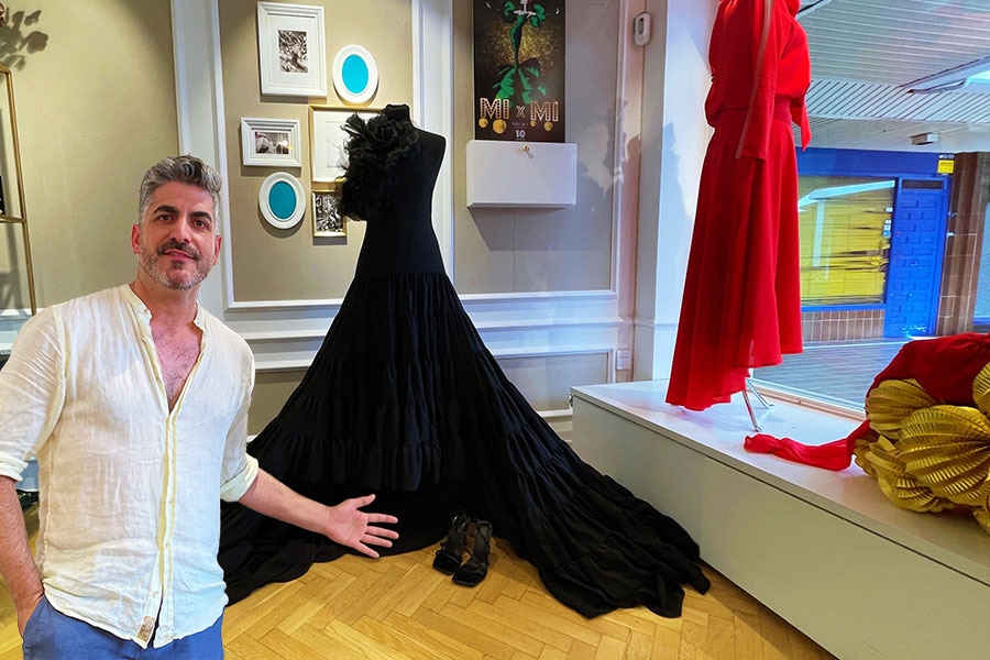Famous Designer Javier Garcia flaunts the unique and modern flamenco dress of his design, weighing 15 kg and priced at EUR 1500. Image: Veidehi Gite