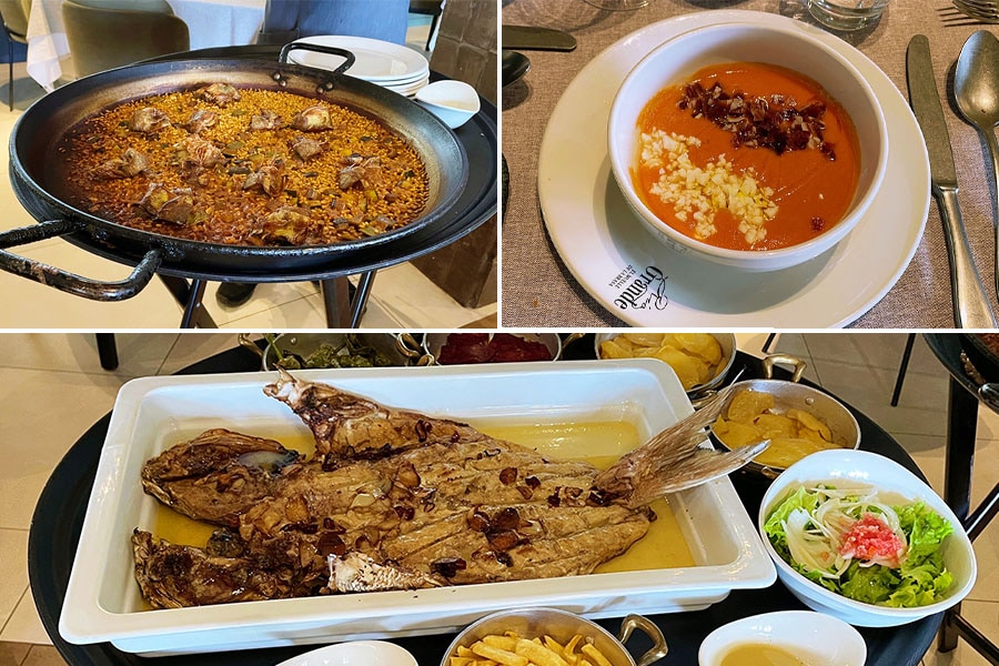 Traditional Andalusian cuisine at Rio Grande restaurant in Seville: From left to right - Paella de alcachofas (artichoke paella), Salmorejo (a traditional tomato soup), and La Corbina (grilled seabass) from Conil.