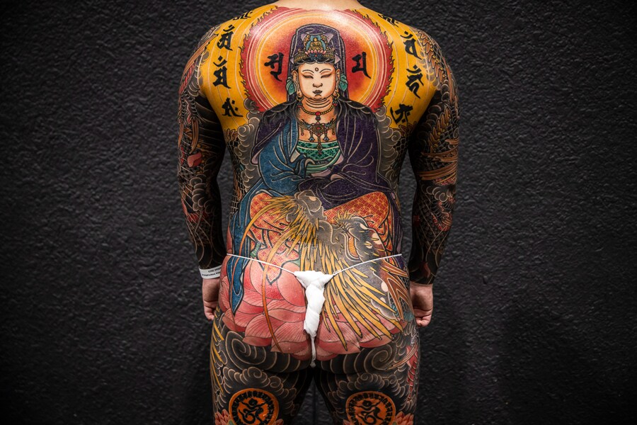 A man shows his tattoos at the 7th Hong Kong China International Tattoo Convention in Hong Kong on August 25, 2023. Tattoo enthusiasts’ fight against society’s deep-rooted biases and stereotyping of people with body ink is still an ongoing one, though much fewer people relate tattoos to gangsters now.