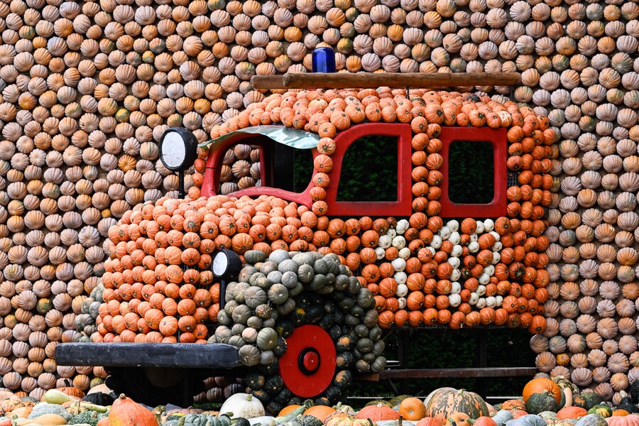 A fire engine made of pumpkins is seen at a pumpkin exhibition in the garden of Ludwigsburg Castle in Ludwigsburg, Germany, on August 24, 2023. The pumpkin exhibition is themed "Fire" and lasts until December 3, 2023. There are about 450,000 pumpkins and 600 different kinds of pumpkins at this festival. And a wide variety of pumpkin-inspired foods.