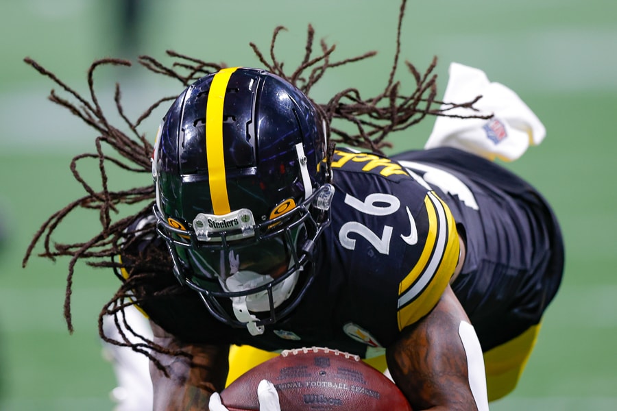 Anthony McFarland Jr. of the Pittsburgh Steelers rushes during the first quarter of a pre-season game against the Atlanta Falcons at Mercedes-Benz Stadium, Atlanta, US, on August 24, 2023. Anthony capped off a Steelers drive with a 5-yard touchdown run.