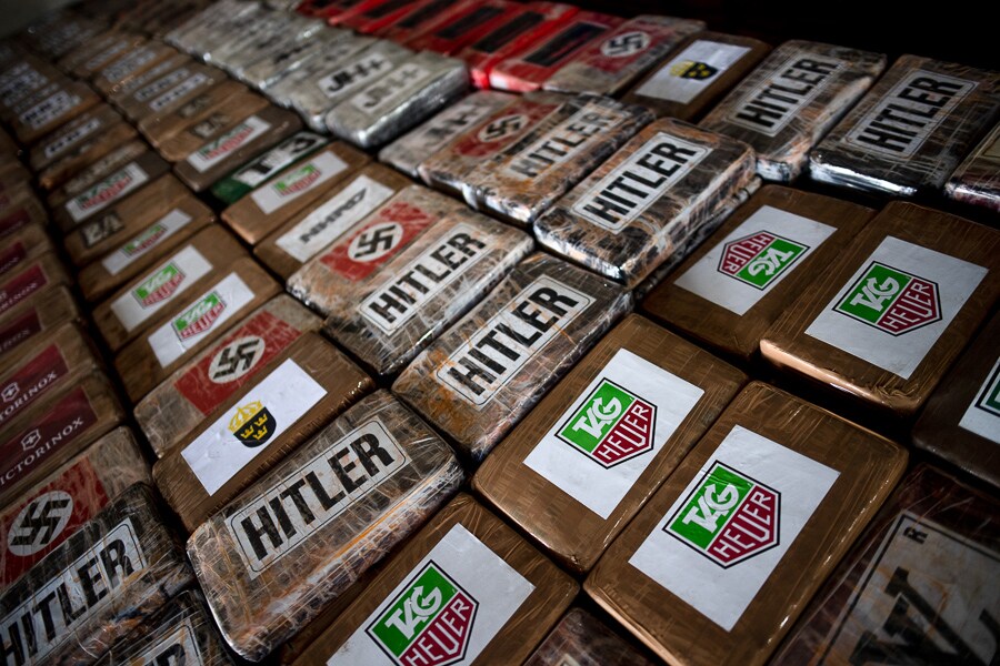 Spanish police and customs officials display packages of cocaine totalling 9,436 kg seized from a refrigerated container coming from Ecuador, among banana crates, at the port of Algeciras, southern Spain, on August 25, 2023. The seizure is Spain"s biggest to date.