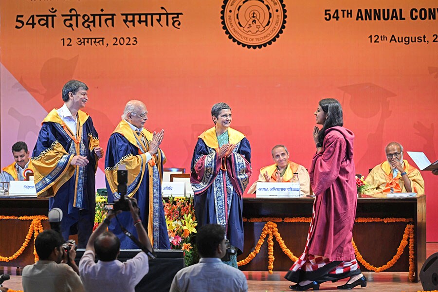 A newly graduated student from IIT Delhi receives her degree from the scientist and chief guest Dr Gagandeep Kang with Dr Rajagopala Chidambaram, Chairperson of Board of Governors, IIT Delhi and Rangan Banerjee, Director, IIT Delhi, during 54th Convocation of Indian Institute Of Technology Delhi on August 12, 2023 in New Delhi. Over 2,350 students receive degrees on the day.