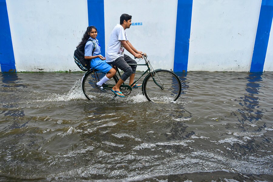 A parent takes his daughter to school through a flooded road after heavy rain caused massive water logging in Kolkata on August 2, 2023.
