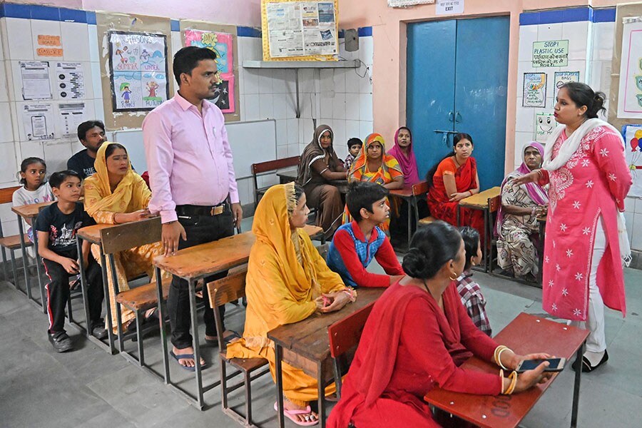 A teacher interacts with parents and students at a first-ever joint mega parent-teacher meet at a Municipal Corporation of Delhi (MCD) School in West Patel Nagar, New Delhi, on April 30, 2023. The event encouraged parents to participate in their children"s education and provide valuable suggestions to improve the schools.