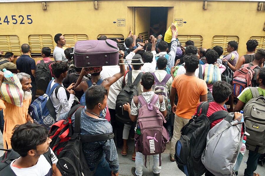 Aspirants gather to board a train after the last day of the 2023 Bihar Teacher Recruitment exam at Patna railway station on August 26, 2023. Bihar Public Service Commission conducts the exam to recruit primary, secondary, and higher secondary level teachers in the state government-run schools.