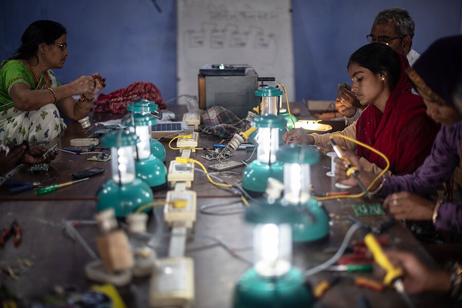 Villagers assemble solar lamps in a class held as part of the Barefoot Solar Project to bring solar-powered lighting to rural areas in Solawata, Rajasthan, on March 25, 2023. The college focuses on expanding access to electricity to help reduce poverty in rural and marginalised communities. They train women to make and install solar lamps and lighting systems, thus bringing clean solar energy to remote villages.