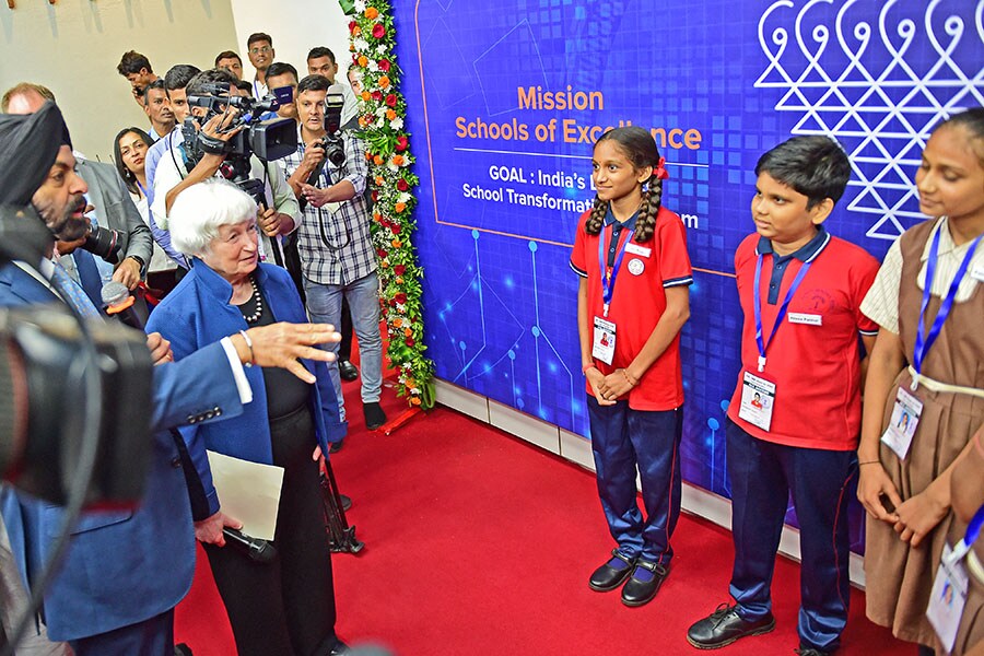 World Bank chief Ajay Banga (left) and US Treasury Secretary Janet Yellen interact with students at a school on the sidelines of a G20 finance ministers" summit in Gandhinagar, Gujarat, on July 16, 2023.