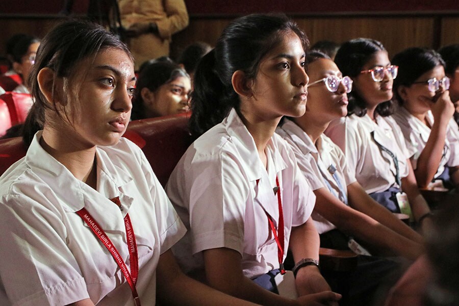 Indian students stay glued to the live telecast of ISRO’s Chandrayaan-3 landing on the moon at the Birla Industrial and Technological Museum (BITM) in Kolkata on July 14, 2023.