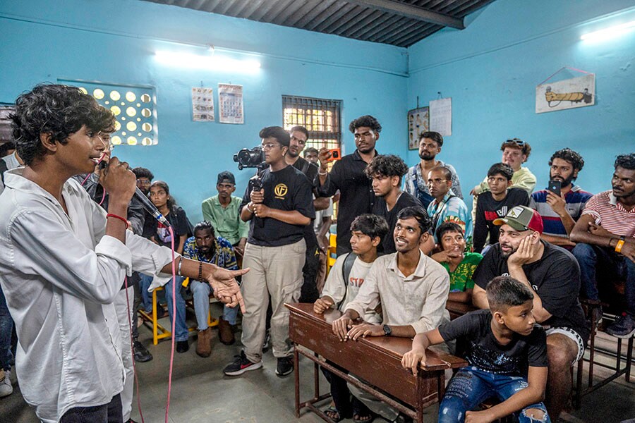 A talented youth from Dharavi raps to an audience mentored by Bollywood singer Badshah upon launching a state-of-the-art recording studio for ‘The Dharavi Dream Project’ in Dharavi, Mumbai, on July 15, 2023. The Project aims to identify, nurture, and showcase talent by empowering underprivileged youth in Dharavi through their free school of hip hop. This initiative mentors and teaches elements like rapping, beatboxing, graffiti styles, and breaking to over 500 students of the 5-24 age group.