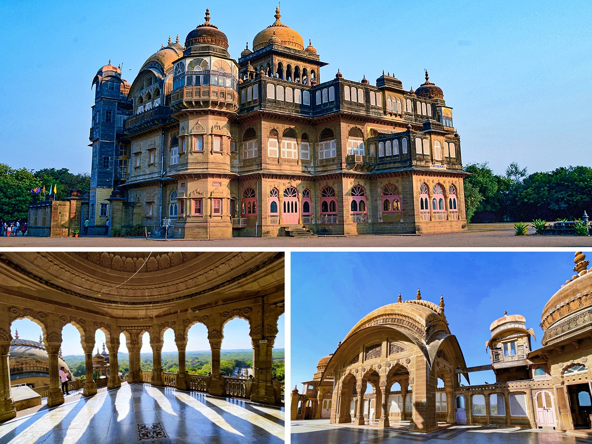 Built during Khengarji III"s reign as a summer retreat for his son in the 1920s, the Vijay Vilas Palace highlights exquisite craftsmanship, with artisans from Bengal, Rajasthan, Saurashtra, and Kachchh contributing to its carved jalis, pillars, jharokhas and Bengal domes.Image: ( above) Getty Images (below) Veidehi Gite