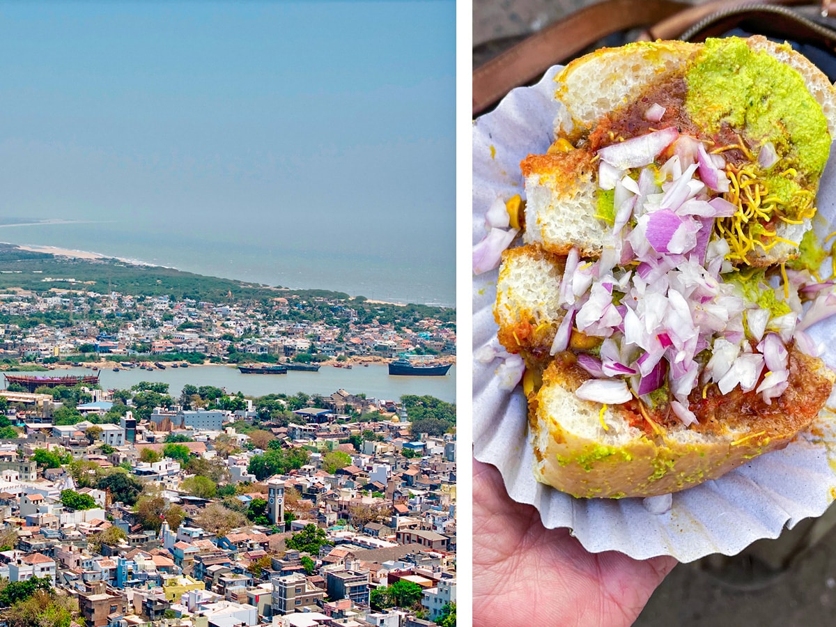 Mandvi, a historic port city on Gujarat"s coast, is also the birthplace of Dabeli, a flavorful street food featuring spiced potato filling, tangy chutneys, and crunchy peanuts, wrapped in a soft bun.Image: (left) Shutterstock, (right) Veidehi Gite