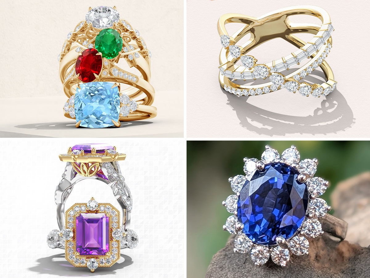 Clockwise from top left: A stack of rings in natural emerald, natural ruby, natural aquamarine and natural diamond with natural diamonds as side stones A ring with 1 carat round natural diamond center stone with natural diamond side stones A ring with 2.00 carat lab grown blue sapphire with lab grown diamond side stones A ring with 4.03 carat, natural amethyst center stone, with natural diamonds side stones.