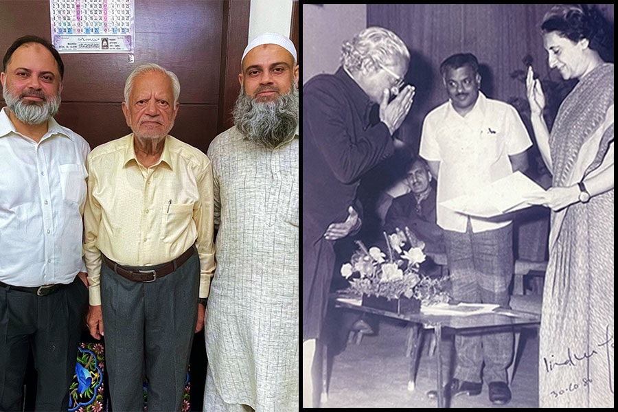 From Left to Right Faizanuddin (L), Raisuddin (C) and Fardinuddin (R) son and grandsons of late Shamsuddin.Sheikh Shamsuddin receiving the award for Zari embroidery by Indira Gandhi, then prime minister of India on 23rd March 1973