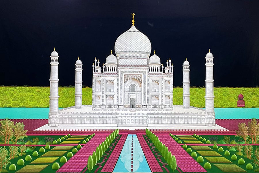 Shams commenced work on this 16 by 12 ft embroidered Taj Mahal in 1982, a project spanning generations as the family continue its completion. Over 150 thread colours and 500 needles were used in its crafting, with approximately 12,500 needles sacrificed in the process.