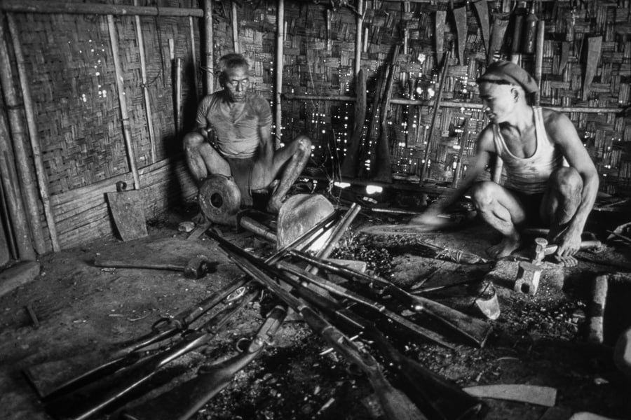 Interior of a Konyak gunsmith"s shop. The Konyak learnt the skill of making muzzle loaders from Myanmar in pre-colonial times. Later, the quelling of a Manipuri rebellion in 1891 resulted in a large number of guns being available in the Naga Hills.