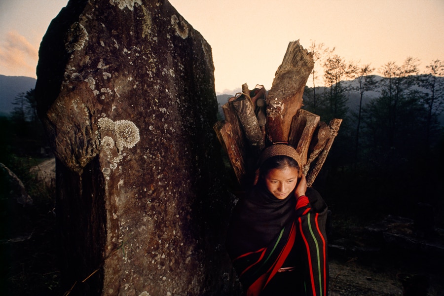 A village woman on her way back from the jungle after collecting wood stands next to a memorial stone, wearing a Lohe: the traditional Angami Naga shawl with three coloured stripes of red, green, red and another red border set off against a black base, Khonoma, Nagaland.