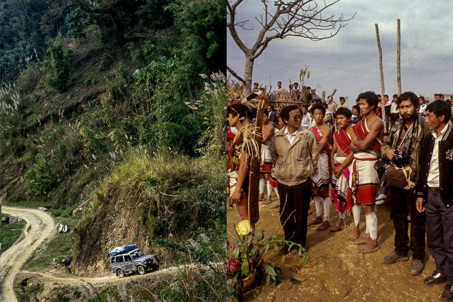 (Left)The Maruti Gypsy that Pablo Bartholomew drove, customised and converted to carry lighting equipment that included strobe units, auto-poles and a generator during his 10-year venture to photograph the Naga people in Arunachal Pradesh, Nagaland and Manipur. (Right) The photographer Pablo Bartholomew (second from right) at a ritual event amongst the Naga tribes of Manipur.
