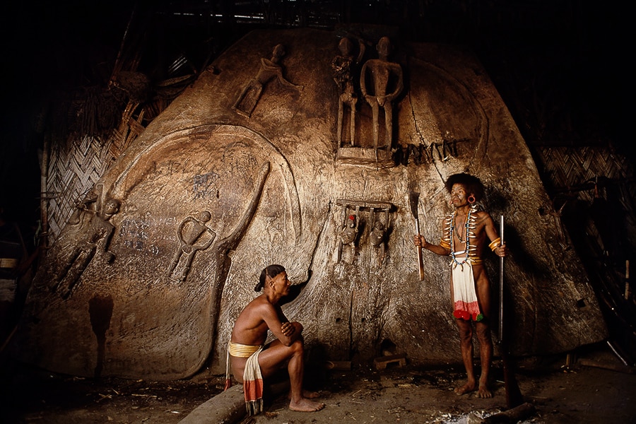 Two Wanchoo warriors stand in front of this large piece of carved wood that contains their myths and legends and shows elements like the snake, rainbow, warriors, monkeys, and a couple standing. The Wanchoos, now in Arunachal Pradesh, believe that they migrated from Shangyu village in Nagaland. The whole tract was known as NEFA (North-Eastern Frontier Alliance) back then, and these state boundaries have only come into existence since the 1960s.