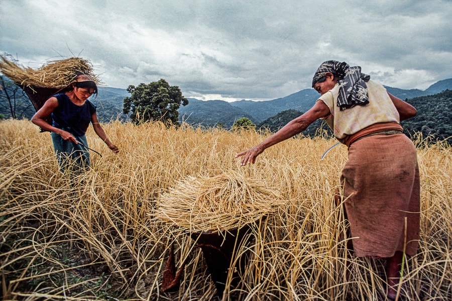 In Western Naga tribes, the Angamis, for example, where there is an abundance of water, terrace cultivation is practised. By late October, the fields are golden brown and ready for harvest. Once the monsoon ends in September, Angami Nagas cut their fields. They gather the cut stems in a large basket, separating the rice from the stalks by hitting them against the side of the basket called Khang. The rice is transported to smaller baskets and carried up to the village, which can be very far away. One can hear songs and shouts all over the hills, which accompany this back-breaking work.