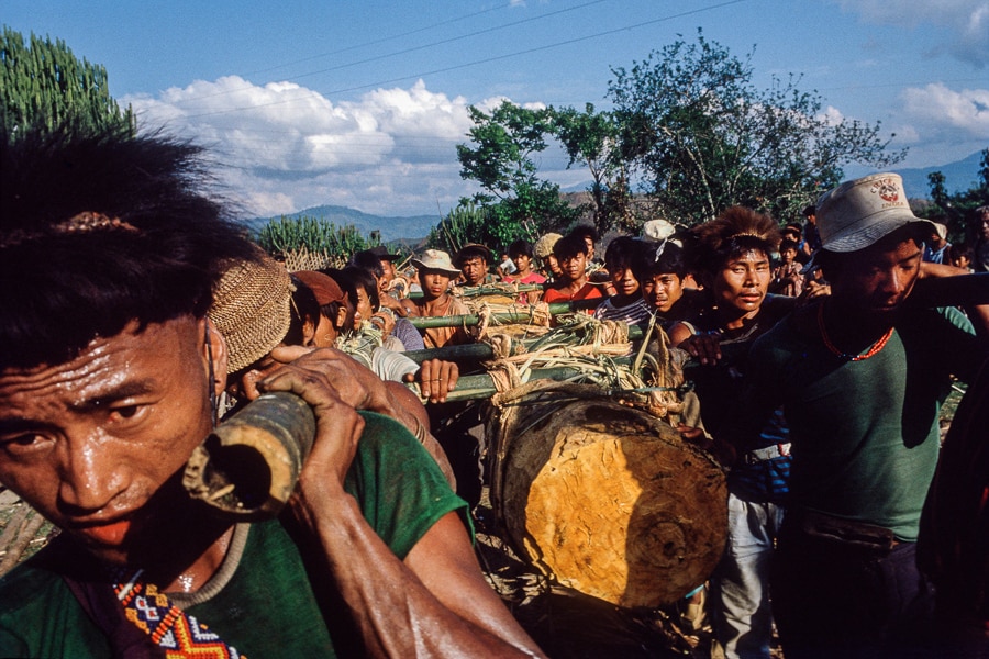 While the reconstruction of the Ang"s (Konyak Naga Chiefs) house is taking place, other groups of men are in the jungle cutting trees and hoisting them on an improvised carrying contraption made with bamboo and vines. Houses are mainly built with poles, bamboo mats, palm leaves and enormous tree trunks.