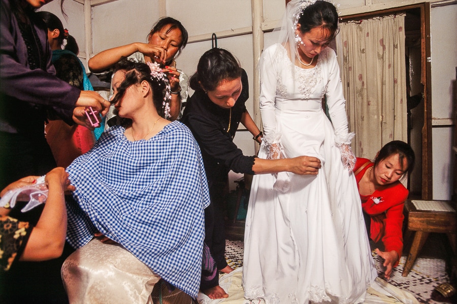 A bride is being dressed in a white bridal dress. Her bridesmaid is in light orange. She will be married according to Baptist rites, and a pastor at KD Baptist Church will perform the wedding.