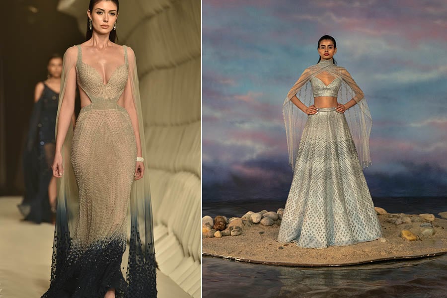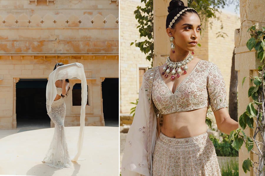 According to Rahul Khanna of the design house Rohit Gandhi and Rahul Khanna, this bridal fashion season is marked by unconventional silhouettes that offer contemporary elegance. "Fishtail or mermaid silhouettes are anticipated to take centre stage, offering a more contemporary and streamlined alternative to the traditional heavy lehengas," says Khanna. "Additionally, there is a notable shift from conventional dupattas to elegant capes, adding a touch of modern sophistication to bridal attire."