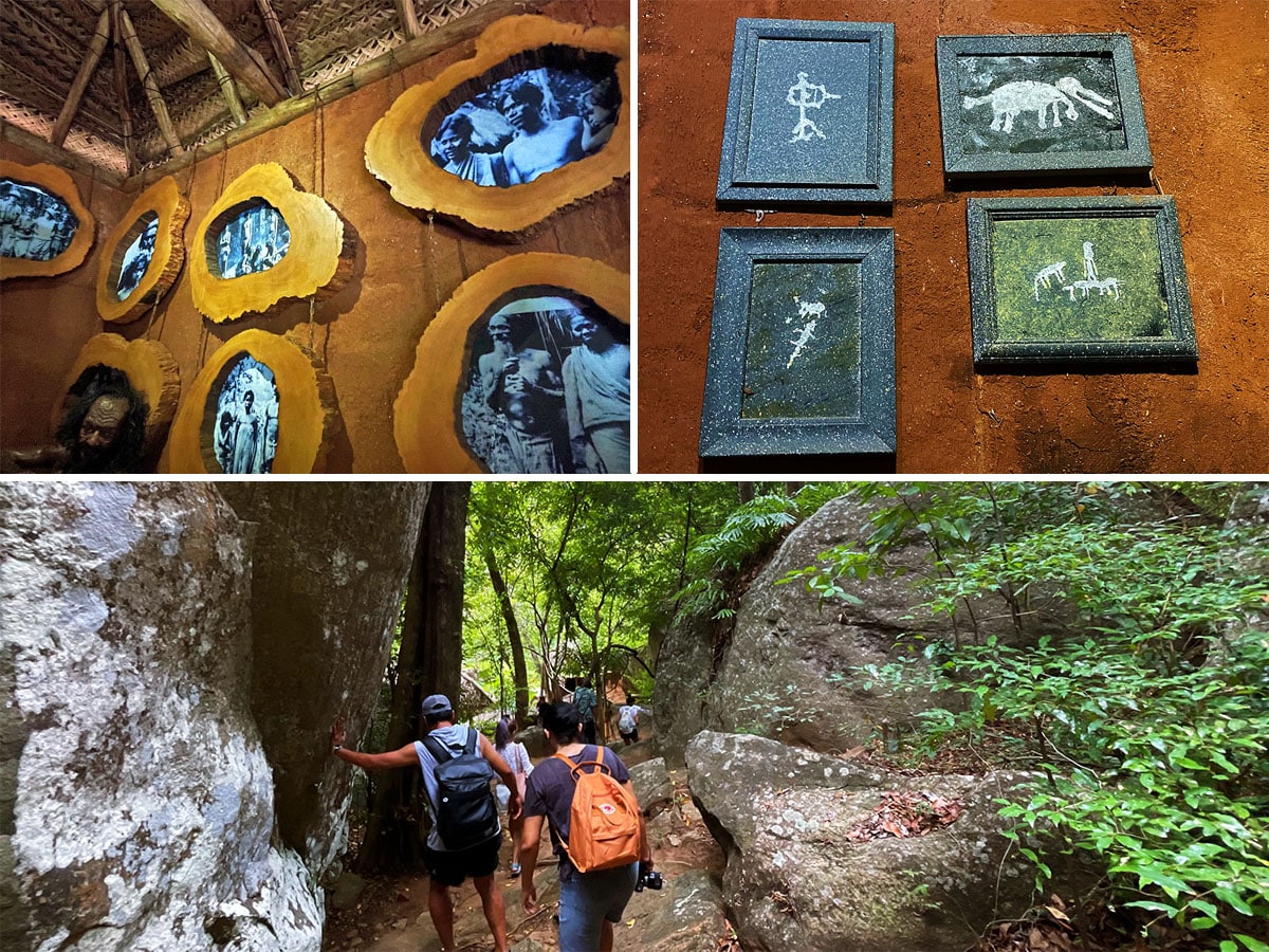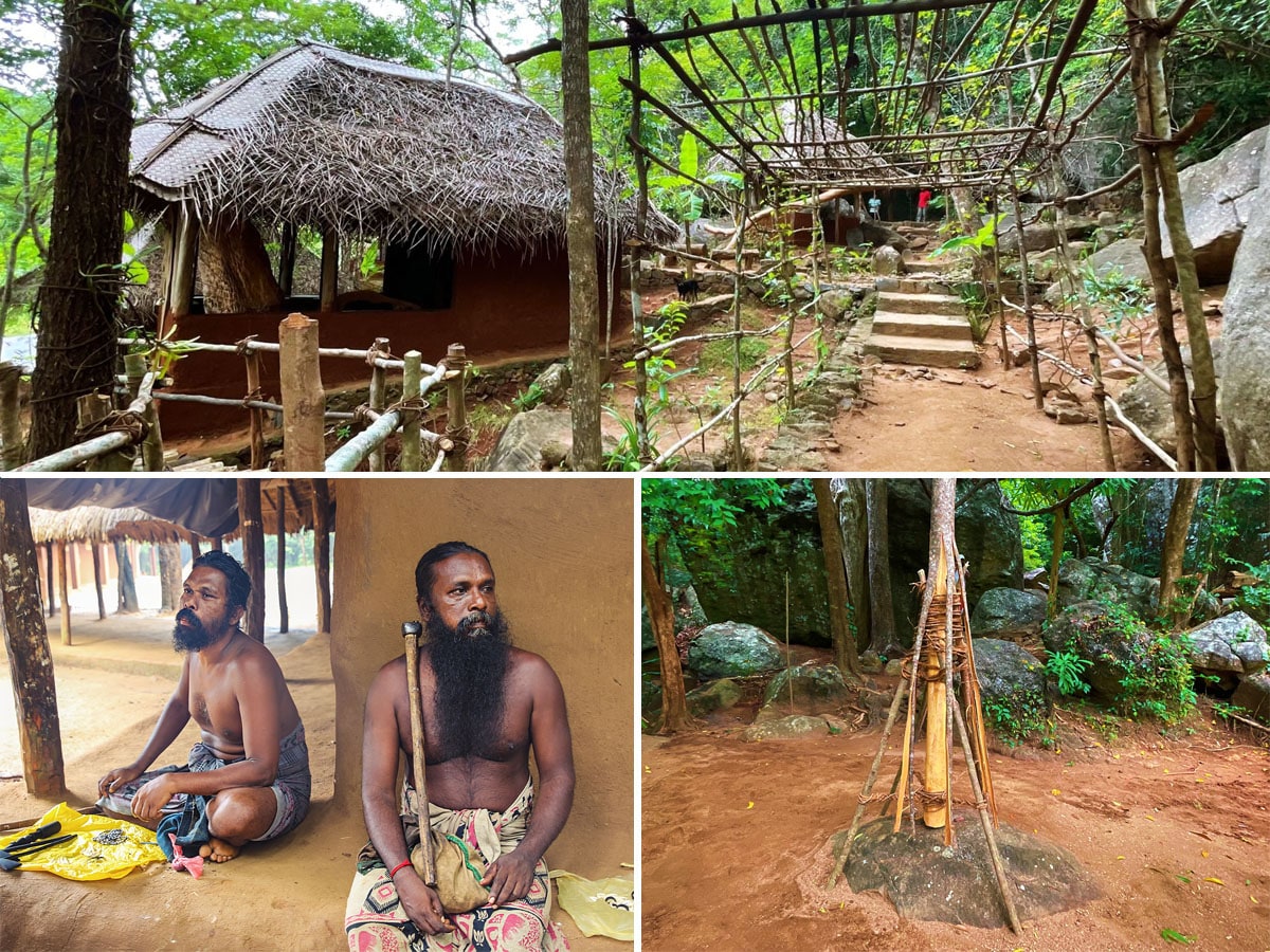(clockwise from top) Veddas" homes set against the backdrop of Bingoda mountains prayer space of the Veddas Veddas at their habitat.Image : Veidehi Gite, Shutterstock