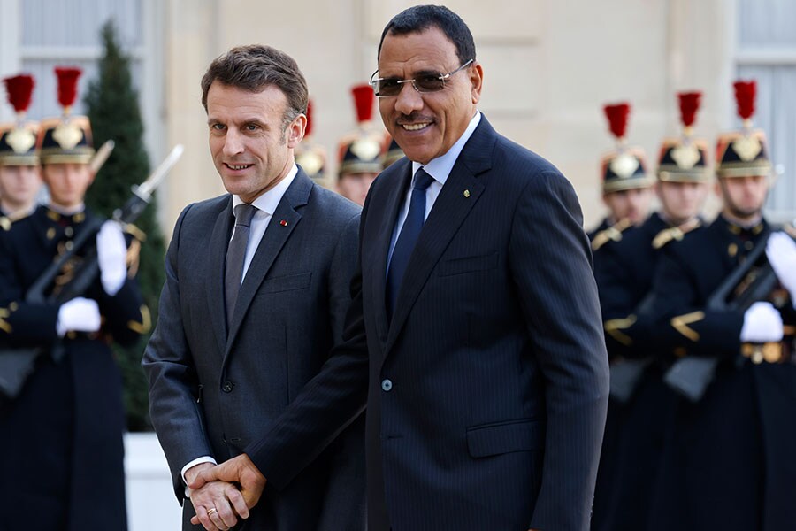 Niger"s now deposed President Mohamed Bazoum is seen welcomed by French President Emmanuel Macron to a working lunch at the Elysee Presidential Palace earlier this year in Paris on February 16, 2023. Mohamed Bazoum was elected president two years ago in the nation’s first peaceful, democratic transfer of power since its independence from France in 1960. Bazoum’s administration has made Niger a key Western partner in the fight against Islamic extremism in Africa’s Sahel region.