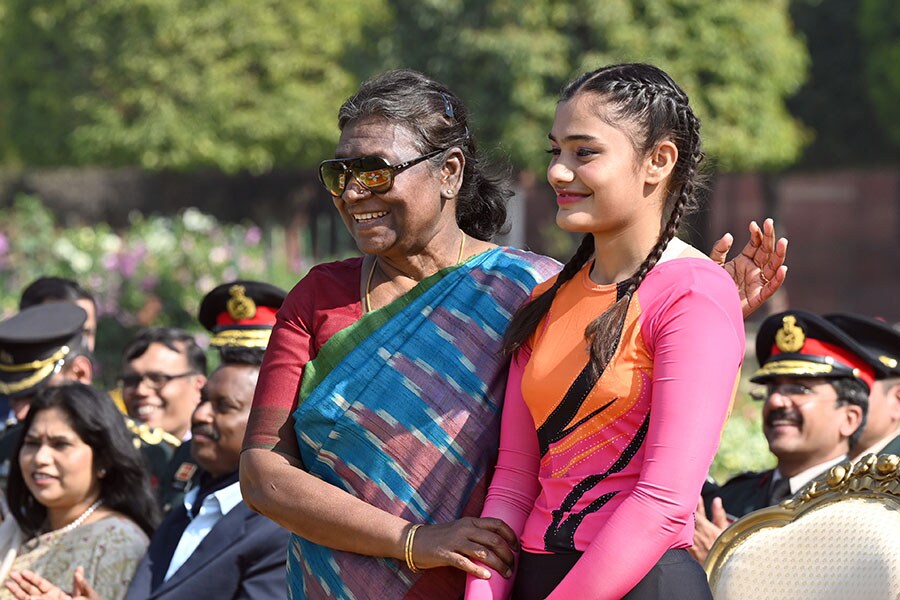 President Droupadi Murmu meets with a tableaux artist who participated in the Republic Day Parade at the Rashtrapati Bhavan on January 27, 2023, in New Delhi, India. Murmu, belonging to the Santhal tribe, has made history by becoming the first woman tribal President of India.
