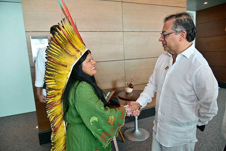Brazilian Minister of Indigenous Peoples Sonia Guajajara greets President Gustavo Petro during the Amazon Summit - IV Meeting of Presidents of States Parties to the Amazon Cooperation Treaty (ACTO) in Belem, Para State, Brazil, on August 8, 2023. Eight South American countries agreed Tuesday (August 8) to launch an alliance to promote sustainable development, end deforestation and fight the organised crime that fuels it.