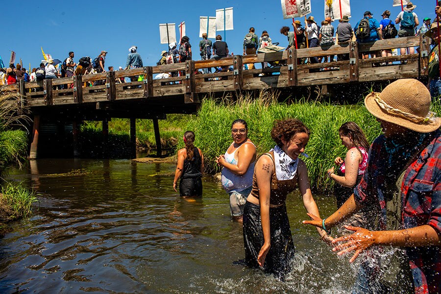 Demonstrators gather in the Mississippi River while others march across it during a "Treaty People Gathering" protest in Clearwater County, Minnesota, US, on June 7, 2021. Environmental and tribal groups say Enbridge Energys"s new pipeline, which would carry Canadian tar sands oil and regular crude, would worsen climate change and risk spills in sensitive areas where Native Americans harvest wild rice, hunt, fish, gather medicinal plants, and claim treaty rights.