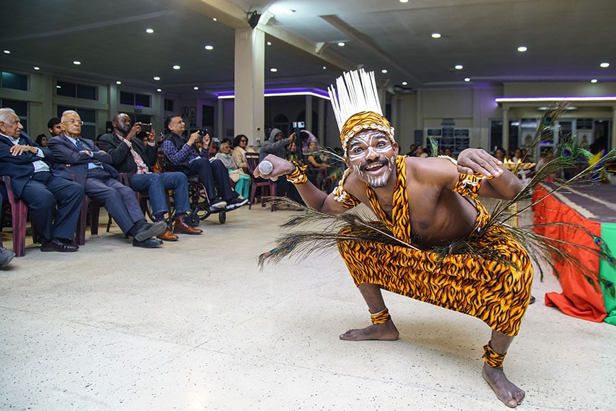 A member of the Sidi Dhamaal Sidi Goma Saiyad Akbarmiya Gulamali Kadari Dance Group performs during the India-Kenya Cultural evening held at the Shri Krishna Hindu Temple in Nakuru, Kenya on June 14, 2023. The Sidis are Indians belonging to the tribal Sufi Community of East African Origin with deep African musical traditions that they have kept alive for generations.