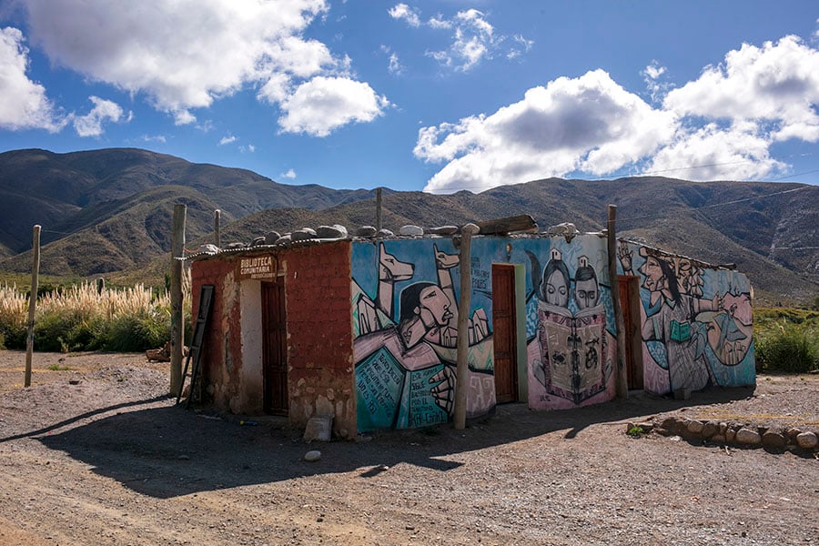 An indigenous painting adorns the shack of a popular community library, "Ambrosio Casimiro", for the native Diaguita language on March 23, 2023, in Cachi, Salta, Argentina.