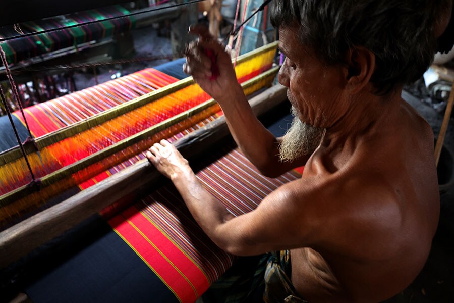 A weaver at work on a traditional fabric pattern for Chakma tribal community in an old handloom factory in Chittagong, Bangladesh, on March 4, 2023. This traditional weave on clothes is being prepared for Biju, one of the major festivals of the minority ethnic group Chakmas who live in the Chittagong Hill Tracts.