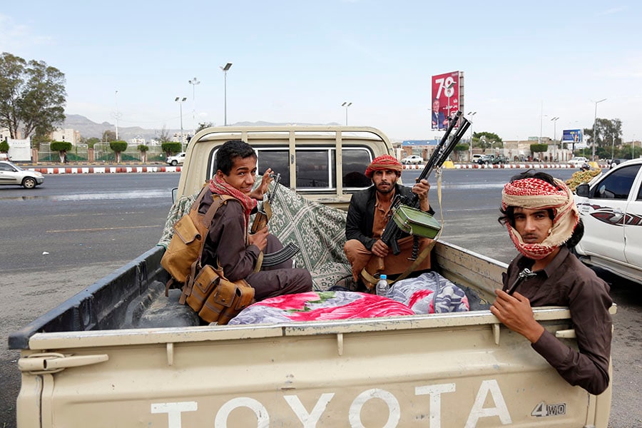Armed Yemeni tribal youth from Abyan province await their military commander Faisal Rajab"s release from Houthi-held Sana"a after being detained for eight years, Sana"a, Yemen, on April 30, 2023.