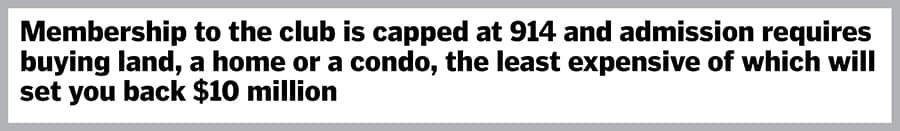 Perhaps the club’s biggest draw is exclusivity. Applicants need gold-plated references and must submit to a detailed background check. Membership is capped at 914 to prevent overcrowding. Admission requires buying land, a home or a condo. Even the least expensive undeveloped plot will set you back $10 million. Condos start at just under $7 million but average $15.5 million homes cost $20 million or more. Then there’s a $500,000 refundable deposit and annual dues of $78,000, which cover unlimited skiing and golfing for your immediate family (including parents and grandchildren, but not adult siblings) plus 140 guest days a year.