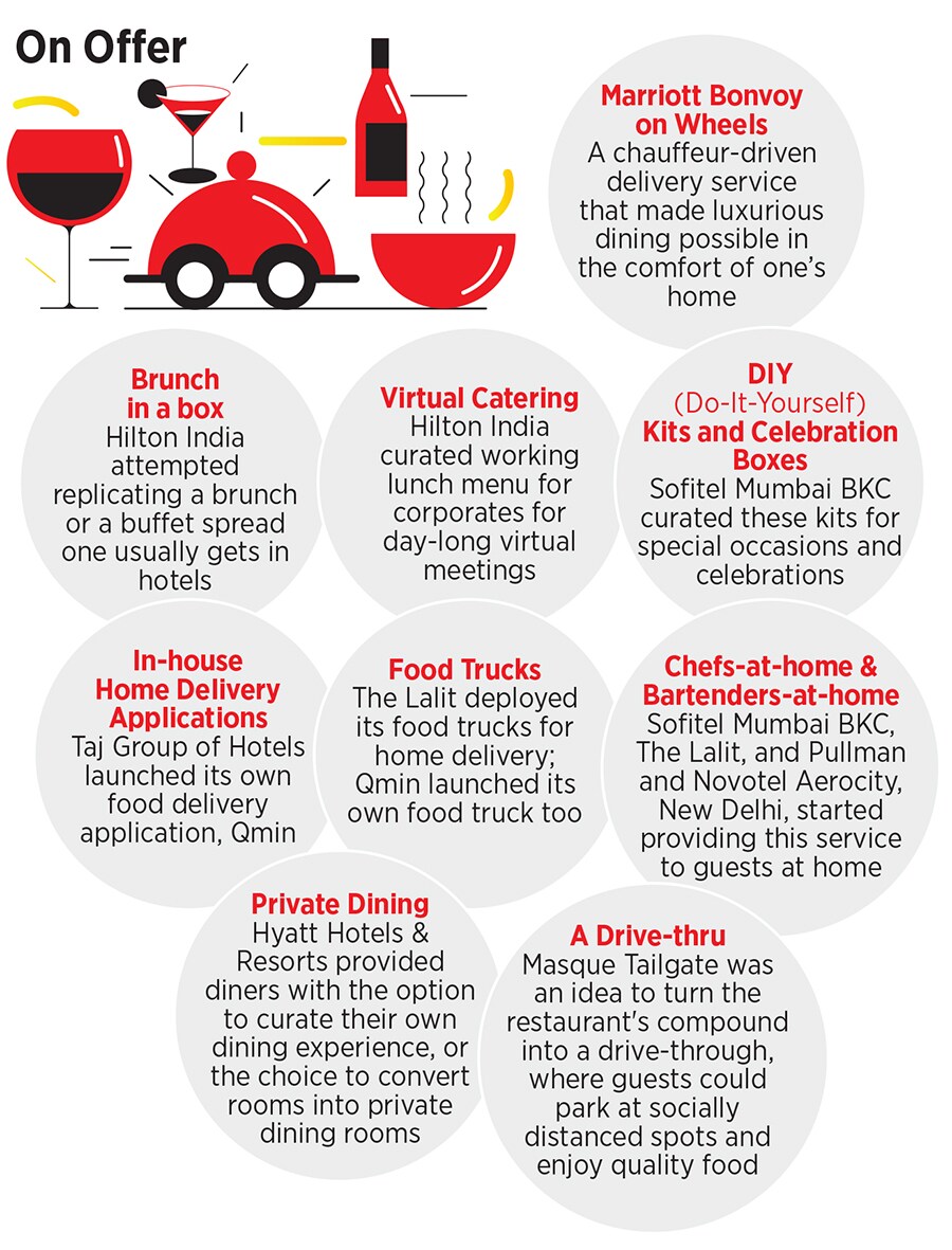 Marriott International, for instance, rolled out the Marriott Bonvoy on Wheels in March 2020, a chauffeur-driven delivery service that made luxurious dining possible at home. Initially started in Mumbai and Delhi, it is now available in 80-plus hotels across India, including Tier II and III cities.