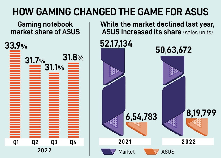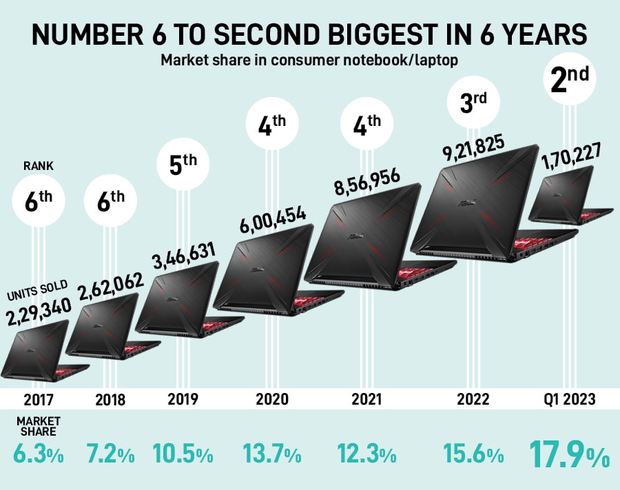 The secret sauce had two interesting ingredients: Focus on premium segment, and dominating the gaming laptop market. While the gaming laptop market declined from 52 lakh in 2021 to 50 lakh in 2022 (see box), ASUS sold more—6.5 lakh to 8.19 lakh—during the same period. “Asus dominate the entire premium segment from Rs80,000 to Rs2 lakh of gaming laptop. We have more than 40 percent market share," claims Su. Now, contrast this with the market share in the entry-level segment. “It’s around 20-25 percent," he adds. In the first five months of this year, Su underlines, while consumer laptop market declined by around 12-13 percent, ASUS’ gaming laptop market increased by 10 percent. “Consumer notebook is falling and this market is growing," he adds.